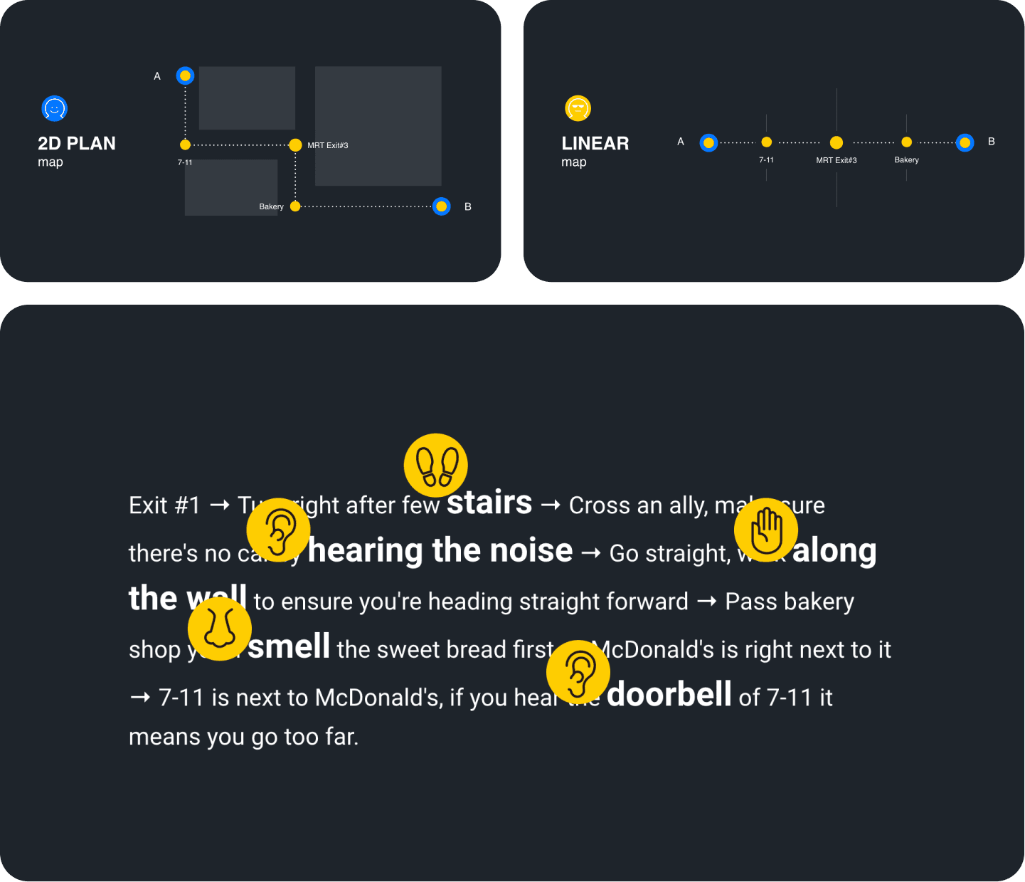 Have you ever thought of how a visually impaired person finds their way to a destination? Or how they memorize routes to familiar places like school, work, or home? Through our research, we uncovered hidden challenges visually impaired individuals face in their daily lives. Current navigation apps on the market are too complex for visually-impaired people to use with VoiceOver, and their navigation hints are overly visual-oriented.