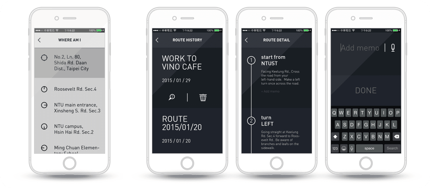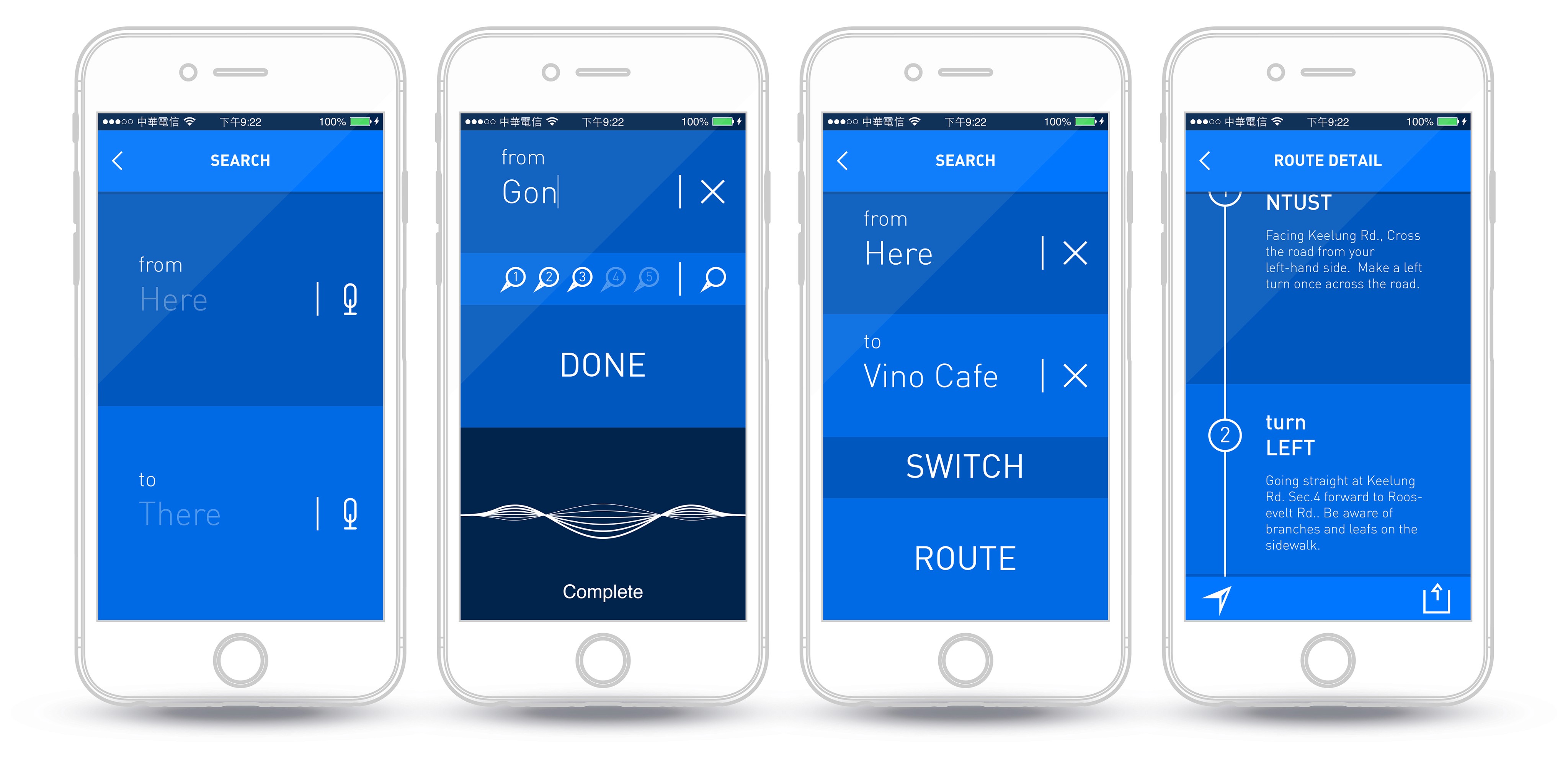 Our team designed an iOS app that offers four key features aligned with visually-impaired people's natural navigation habits: searching for a location, navigating to a destination, identifying the current location, and tracking navigation history.